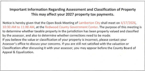 Public Announcements and Notices can be found at https://lambertonmn.com/notices